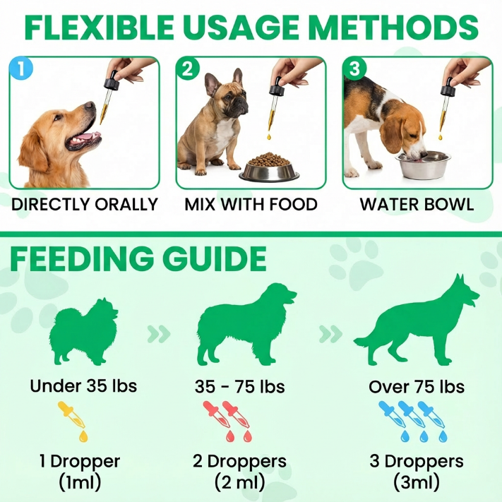 Simply mix into your dog’s food once daily. The liquid is tasteless, so most dogs don’t notice it at all.